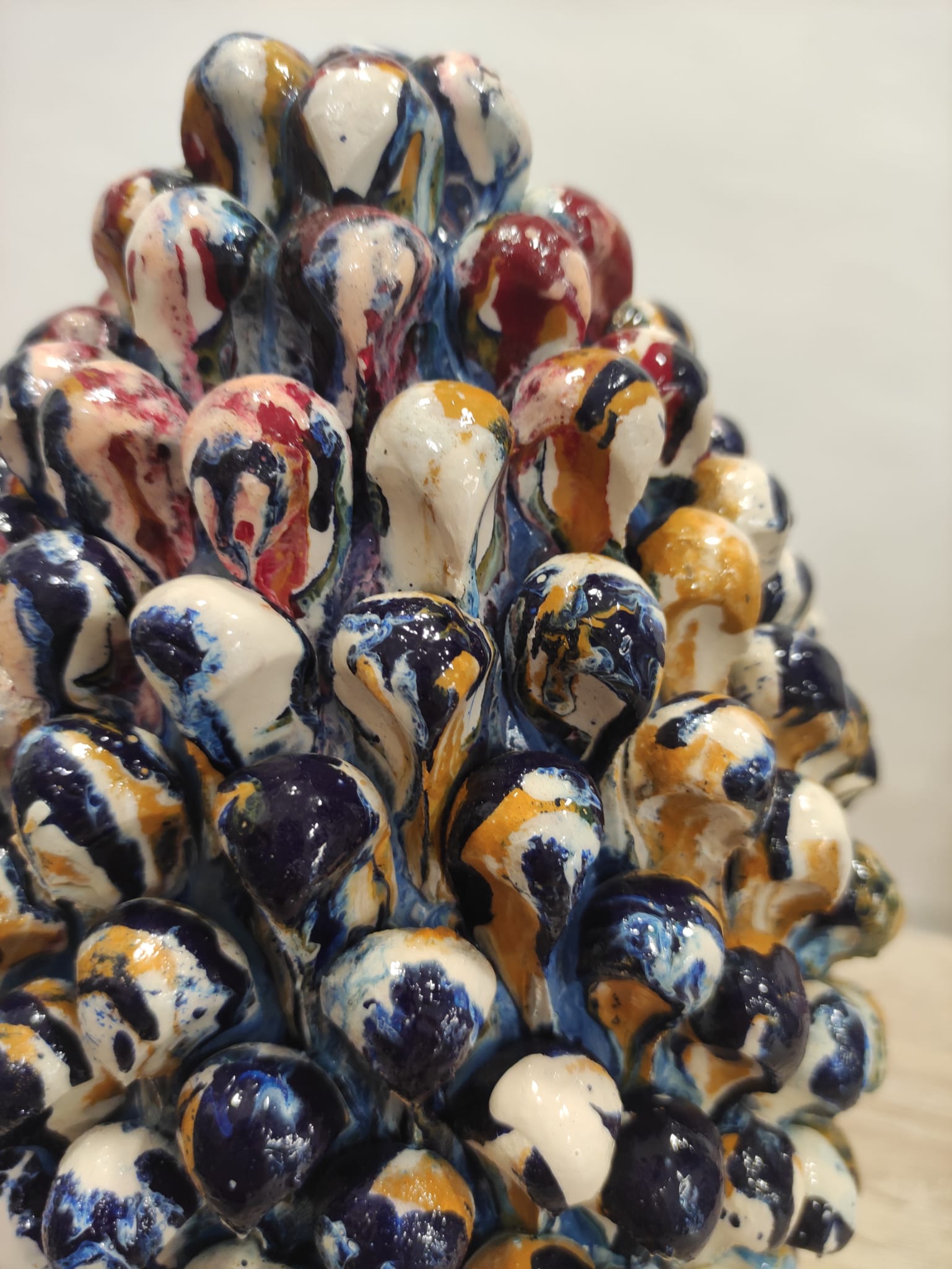 La Pigna Colata è un esempio di arte fresca. Realizzata con materiali di alta qualità, è un’opera che unisce bellezza e varietà cromatica. La scelta multicolor sull’azzurro riflette l’impegno per un’arte che rispetta la tradizione. Questo pezzo non è solo un elemento decorativo, ma anche un simbolo di un approccio artistico vivace e autentico.