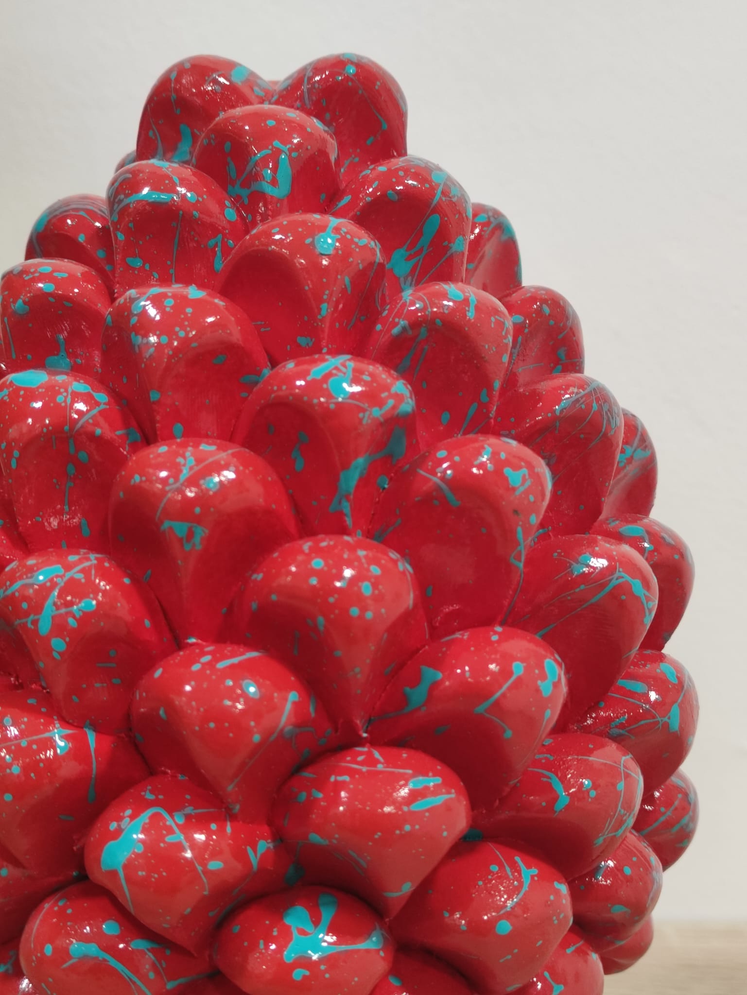 Il rosso corallo, simbolo del prezioso corallo di Sciacca, si fonde armoniosamente con il turchese, rappresentando la bellezza e la profondità del mare siciliano. Ogni dettaglio è stato realizzato con passione e dedizione, rendendo questa pigna un autentico gioiello artistico.