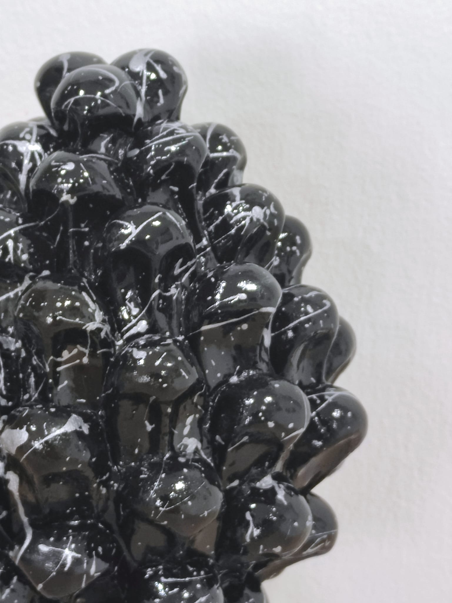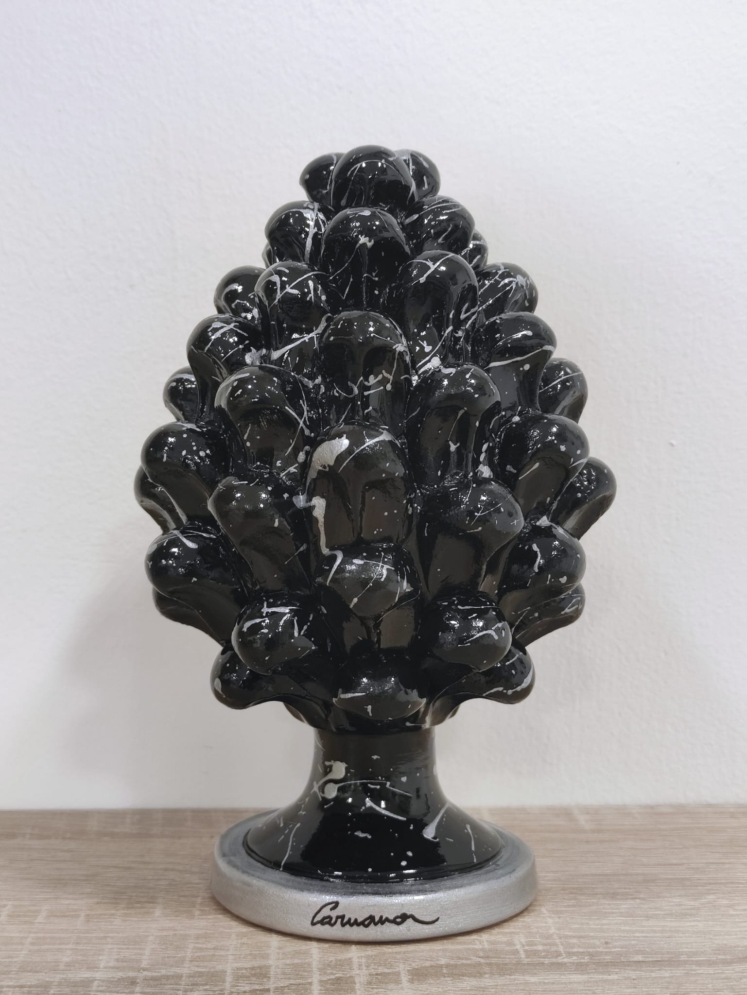 Il mix tra il nero intenso e l’argento brillante non è solo un gioco di colori, ma racconta una storia di contrasti e carattere. Il nero, profondo e misterioso, rappresenta le radici antiche dell’arte siciliana, mentre l’argento, luminoso e prezioso, simboleggia l’evoluzione e la modernità dell’artigianato. Questa pigna non è solo un oggetto decorativo, ma un racconto visivo di passato e presente, di tradizione e innovazione.
